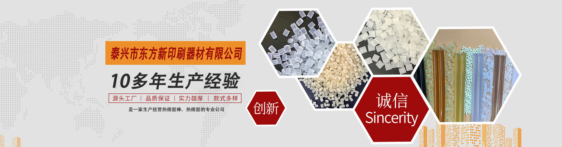 泰興市東方新印刷器材有限公司是專一生產(chǎn)綠色環(huán)保型印刷裝訂書刊熱熔膠,封箱包裝熱熔膠,吸管膠,鞋材熱熔膠,冰箱熱熔膠,熱熔膠棒,地毯背膠等。產(chǎn)品具有快速粘接、耐老化、強(qiáng)度高、熱穩(wěn)定性好、無毒害等優(yōu)點(diǎn),廣泛用于無線膠訂、自動化封箱,飲料吸管粘結(jié)接,電子電器、工藝品、玩具、家具等領(lǐng)域,公司與多家科研機(jī)構(gòu)建立了緊密的戰(zhàn)略合作關(guān)系,質(zhì)量達(dá)到先進(jìn)水平,產(chǎn)品已銷往全國30多個(gè)省市地區(qū),并出品到東南亞多個(gè)國家和地區(qū)。    公司堅(jiān)持“誠信為本,貼心服務(wù)”為廣大顧客提供優(yōu)質(zhì)產(chǎn)品,董事長兼總經(jīng)理黃衛(wèi)東先生攜全體員工,竭誠歡迎各界朋友光臨指導(dǎo)、洽談合作、共贏同發(fā)展。    Taixing Dongfang New Printing Equipment Co., Ltd. specializes in the production of green and environmentall…